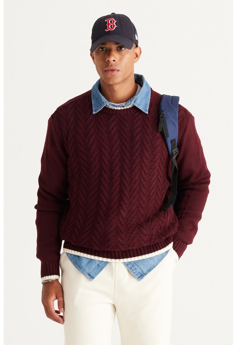 Caracteristici Culoare: visiniu Imprimeu: uni Material: acril Croiala: regular fit Sistem inchidere: fara inchidere Model: rotund Lungime maneca: maneca lunga Detalii: design cu torsade Compozitie Exterior: 100% acrilic