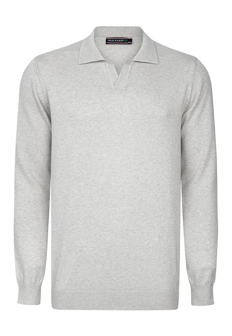Caracteristici Culoare: gri deschis melange Imprimeu: uni Material: bumbac - tricot Croiala: regular fit Sistem inchidere: fara inchidere Model: in v Guler: polo Lungime maneca: maneca lunga Compozitie Exterior: 100% bumbac