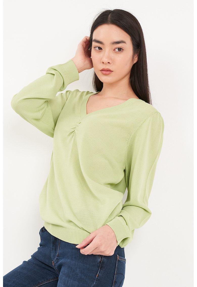 Caracteristici Tip produs: pulover Culoare: verde pal Imprimeu: uni Material: sintetic - viscoza - tricot Model: in v Croiala: regular fit Sistem inchidere: fara inchidere Lungime maneca: maneca lunga Compozitie Exterior: 65% viscoza - 35% poliamida