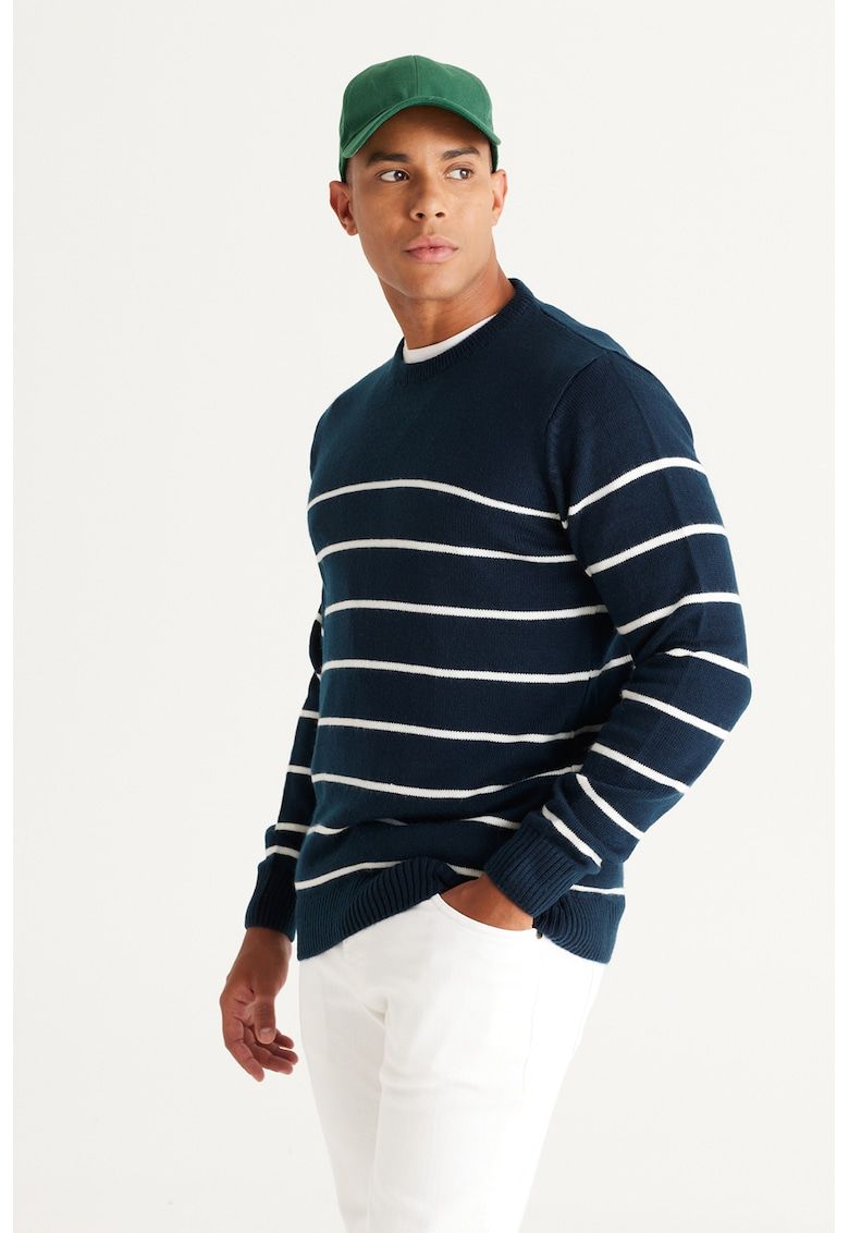 Caracteristici Culoare: alb - bleumarin Imprimeu: dungi Material: poliamida - acril Croiala: regular fit Sistem inchidere: fara inchidere Model: decolteu la baza gatului Lungime maneca: maneca lunga Compozitie Exterior: 90% acrilic - 10% poliamida