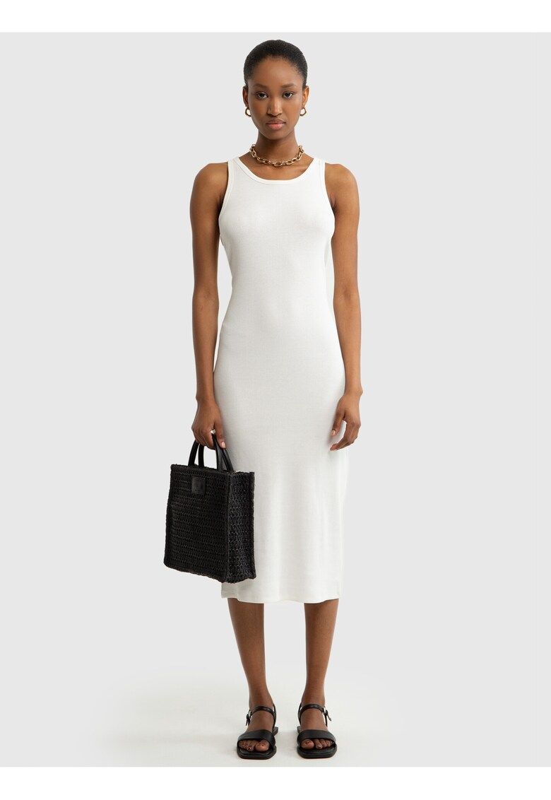 Caracteristici Culoare: alb Stil: casual Material: bumbac - elastan Imprimeu: uni Croiala: bodycon Lungime: midi Decolteu: la baza gatului Lungime maneca: fara maneca Sistem inchidere: fara inchidere Compozitie Exterior: 95% bumbac - 5% elastan