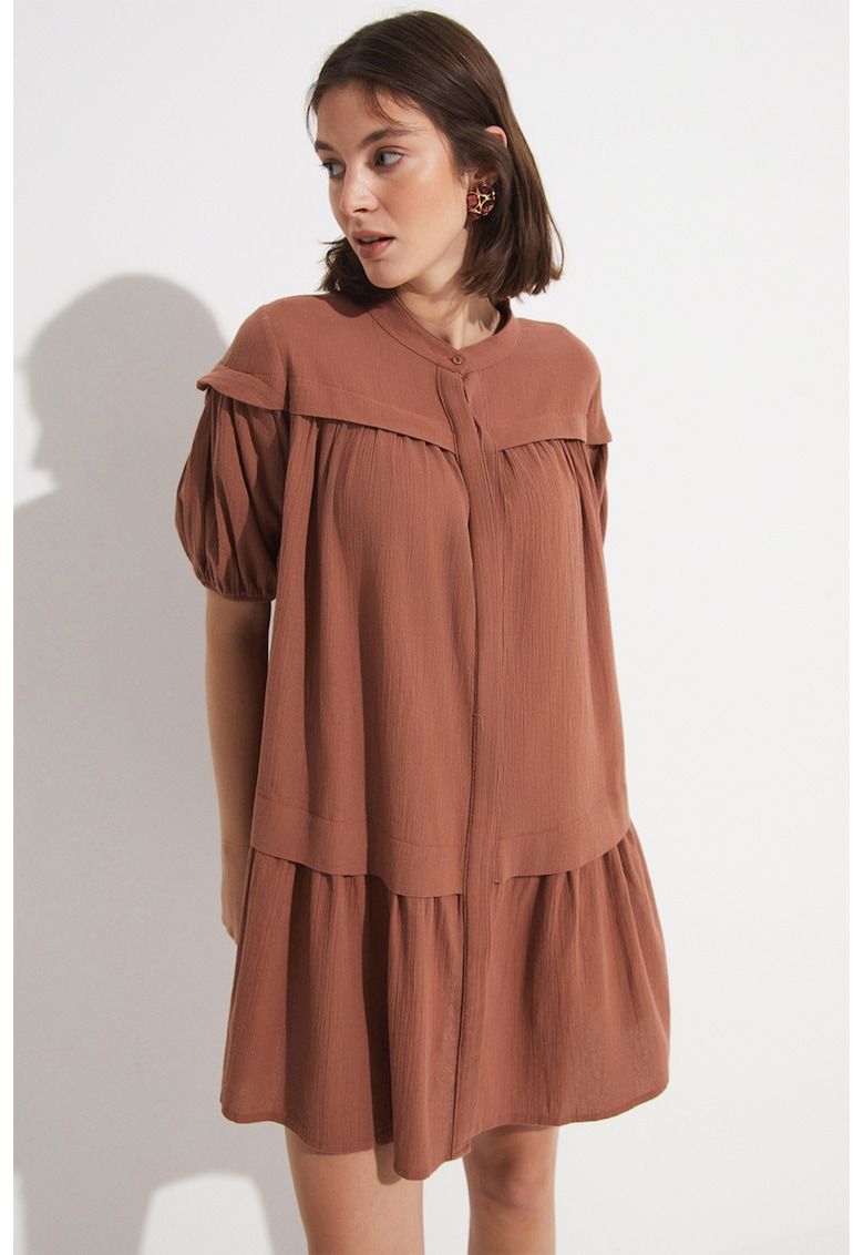 Caracteristici Culoare: maro scortisoara Stil: casual Material: bumbac - in Imprimeu: uni Croiala: evazat Lungime: scurta Lungime maneca: maneca scurta Compozitie Exterior: 70% bumbac - 30% in