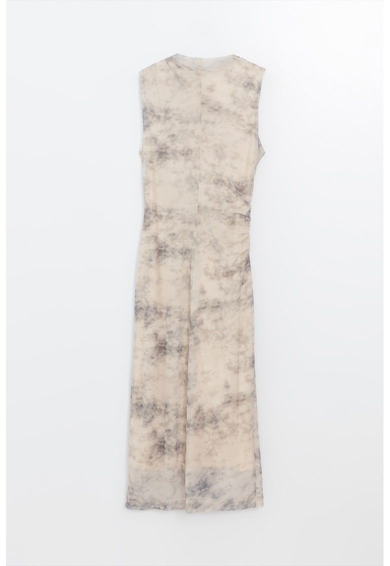 Caracteristici Culoare: maro nisip Stil: casual Material: plasa Imprimeu: tie-dye Croiala: dreapta Lungime: midi Lungime maneca: fara maneca Detalii: slim fit Sistem inchidere: fara inchidere Compozitie Exterior: 95% poliester - 5% elastan Captuseala: 100% poliester