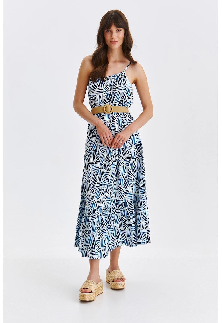 Caracteristici Culoare: alb optic - albastru Stil: casual Material: viscoza Imprimeu: geometric Croiala: evazat Lungime: midi Decolteu: in u Barete: ajustabile Lungime maneca: fara maneca Compozitie Exterior: 100% viscoza