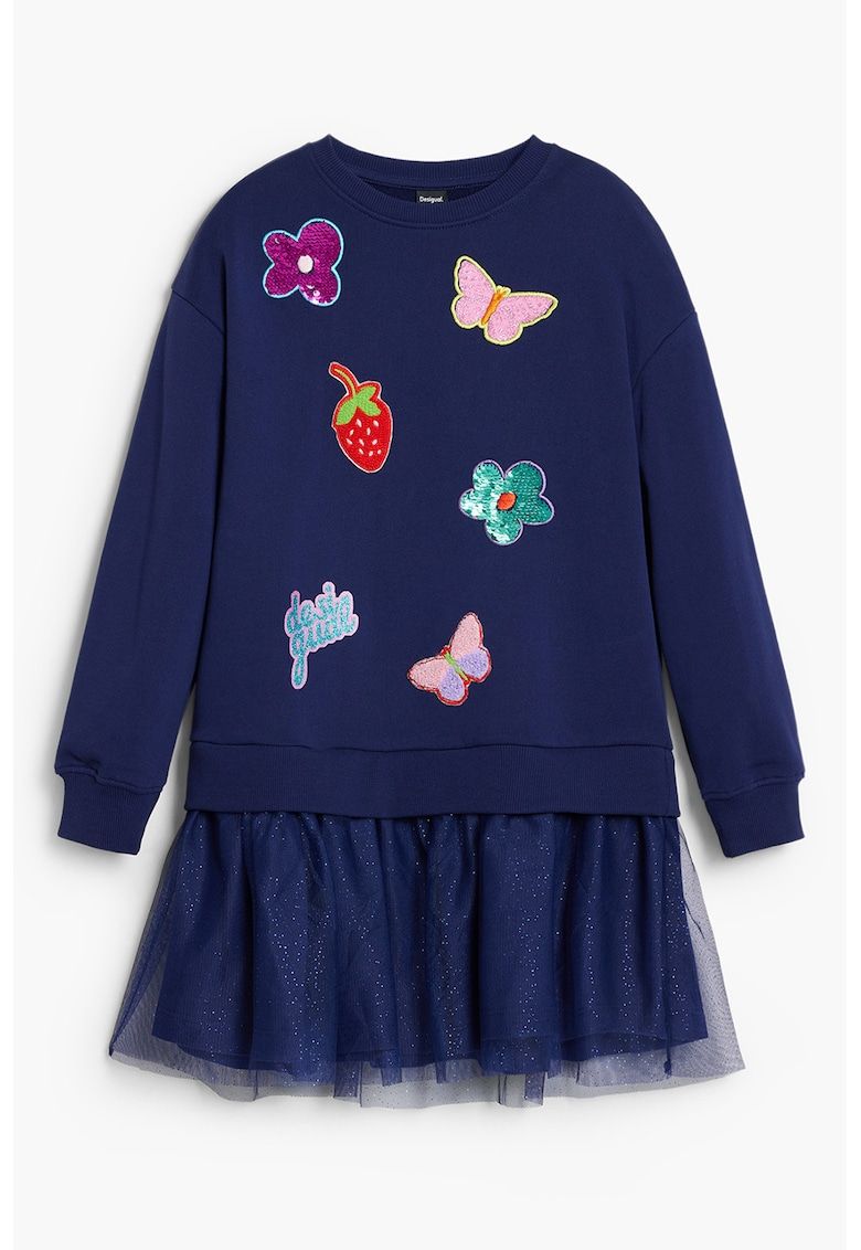 Caracteristici Culoare: indigo Stil: casual Material: poliester - bumbac Imprimeu: grafic Croiala: evazat Lungime maneca: maneca lunga Stil decolteu: la baza gatului Colectie: toamna - iarna Compozitie Exterior: 93% bumbac - 7% elastan