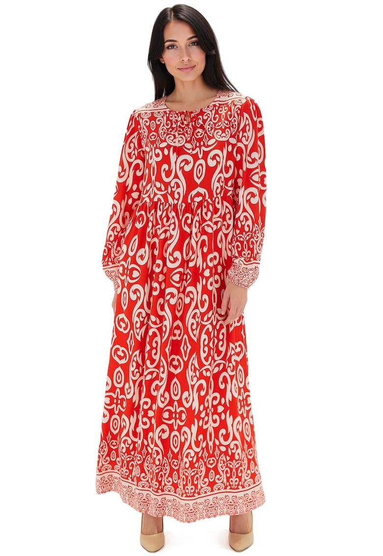 rochie maxi dama - cu imprimeu - inchidere cu snur - viscoza - rosu/bej