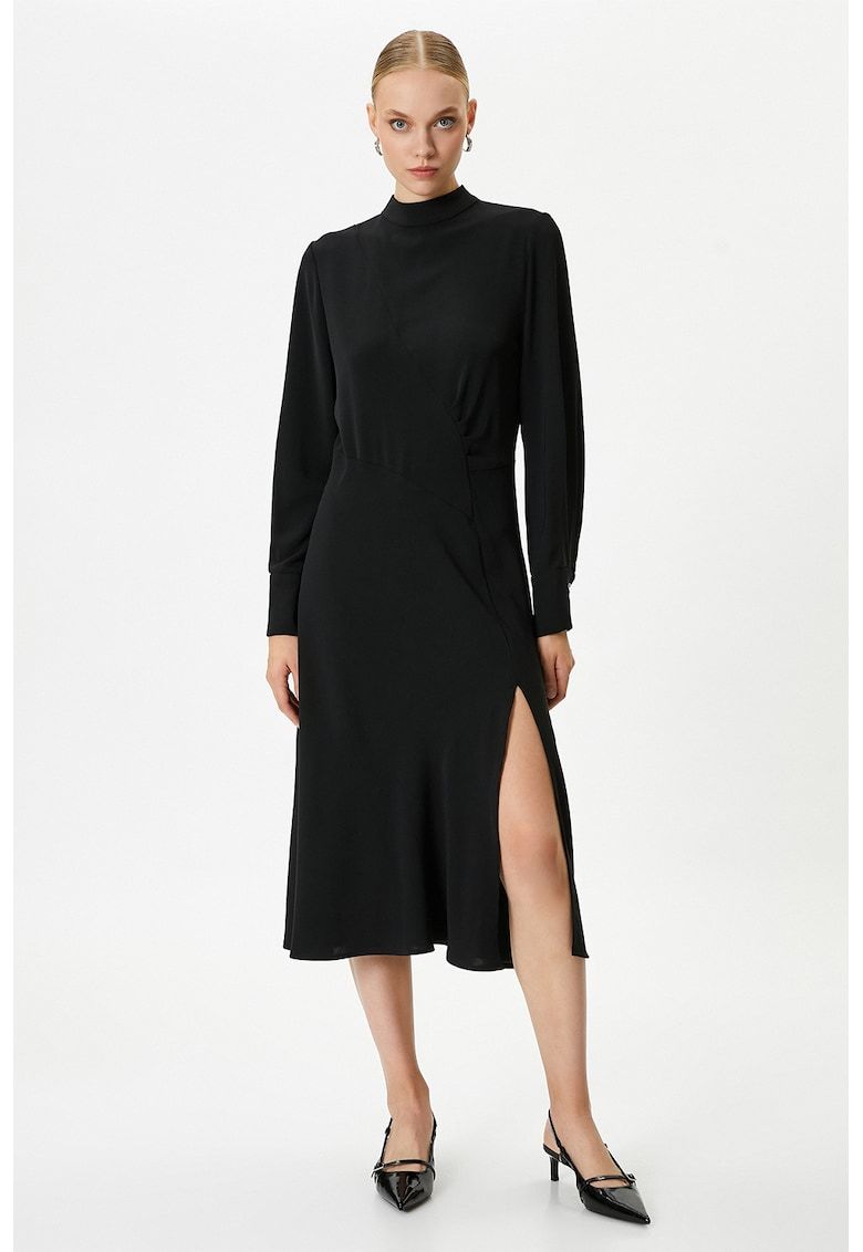 Caracteristici Culoare: negru Stil: casual Material: sintetic Imprimeu: uni Croiala: evazat Lungime: midi Guler: scurt Lungime maneca: maneca lunga Detalii: slit lateral - decupaj pe partea din spate - inchis cu nasture - material vaporos Compozitie Exterior: 100% poliester