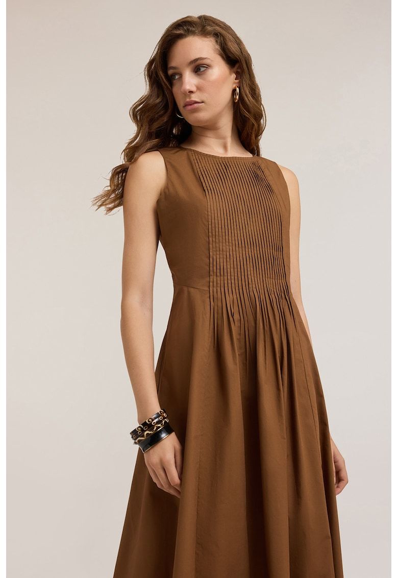 Caracteristici Culoare: maro Stil: casual Material: bumbac Imprimeu: uni Croiala: evazat Lungime: midi Decolteu: rotund Lungime maneca: fara maneca Compozitie Exterior: 100% bumbac