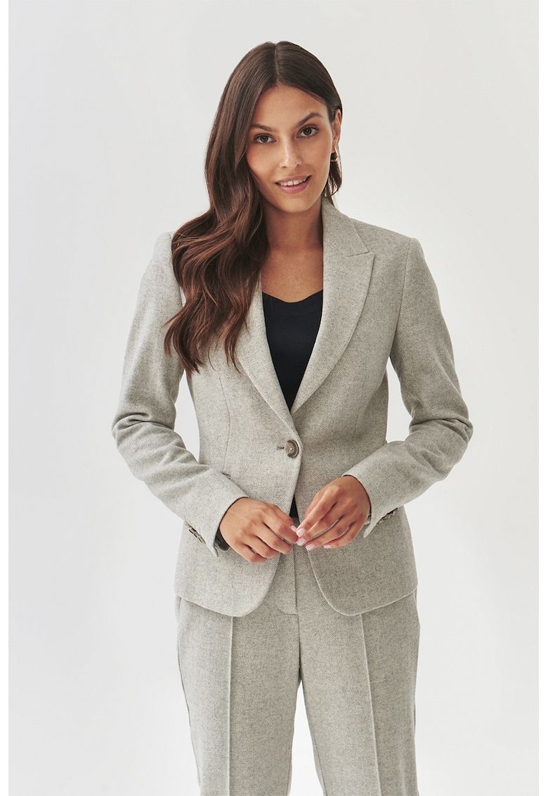 Caracteristici Culoare: gri deschis Stil: elegant Croiala: slim fit Material: sintetic - lana Imprimeu: uni Guler: cu revere Lungime maneca: maneca lunga Buzunare: 2 cu refilet Sistem inchidere: nasturi Compozitie Exterior: 65% lana - 25% poliester - 4% viscoza - 4% acril - 2% poliamida