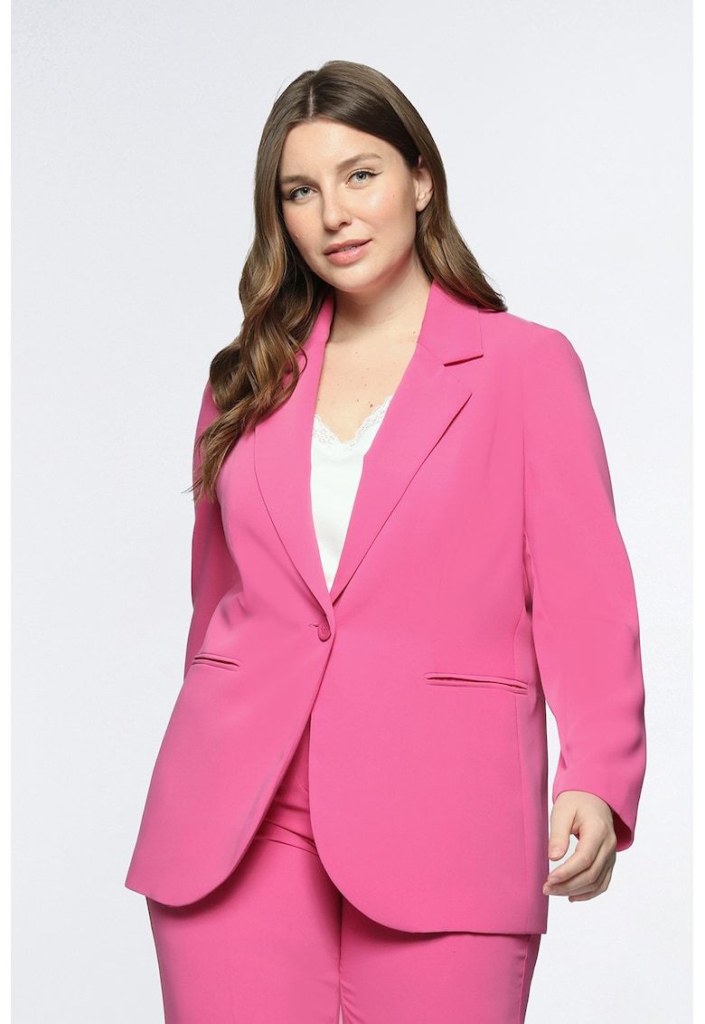 Caracteristici Culoare: roz Stil: elegant Croiala: curvy Material: poliester - elastan Imprimeu: uni Guler: cu revere Lungime maneca: maneca lunga Detalii: acest produs se adreseaza femeilor cu forme pline (plus size). Sistem inchidere: nasturi Compozitie Exterior: 96% poliester - 4% elastan