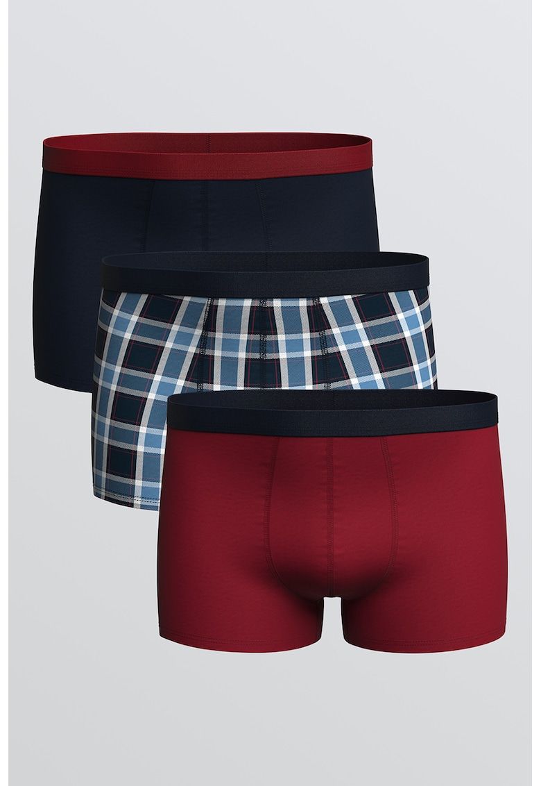 Caracteristici Tip produs: set boxeri Culoare: rosu - bleumarin Imprimeu: carouri - uni Material: bumbac Talie: elastica Compozitie Exterior: 95% bumbac - 5% elastan