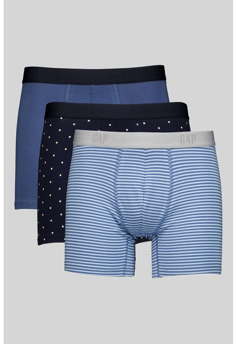 Caracteristici Tip produs: boxeri Continut pachet: 3 perechi de boxeri Culoare: albastru Imprimeu: dungi - buline - logo Material: bumbac - fibre sintetice Compozitie Exterior: 96% bumbac - 4% elastan