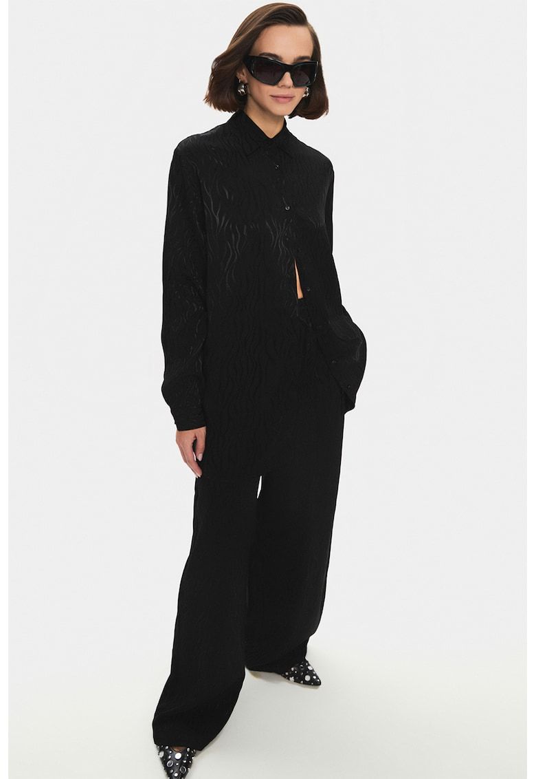 Caracteristici Continut pachet: camasa si pantaloni Culoare: negru Imprimeu: uni Material: viscoza - rayon Stil: elegant Croiala: croiala ampla Guler: clasic Maneci: cu mansete cu nasturi Lungime maneca: maneca lunga Talie: inalta Buzunare: in cusaturile laterale Detalii: snur pentru ajustare si insertie elastica in talie Sistem inchidere: nasturi Compozitie Exterior: 63% raion - 37% viscoza