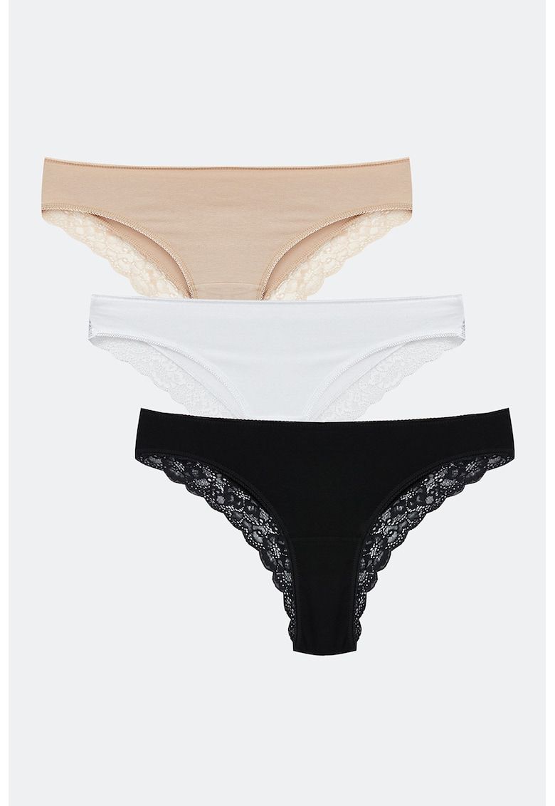 Caracteristici Tip produs: brazilian Culoare: alb - negru - bej Imprimeu: uni Material: bumbac - elastan Numar perechi: 3 Detalii: garnituri din dantela Compozitie Exterior: 96% bumbac - 4% elastan Material garnituri: dantela: 88% poliamida - 12% elastan
