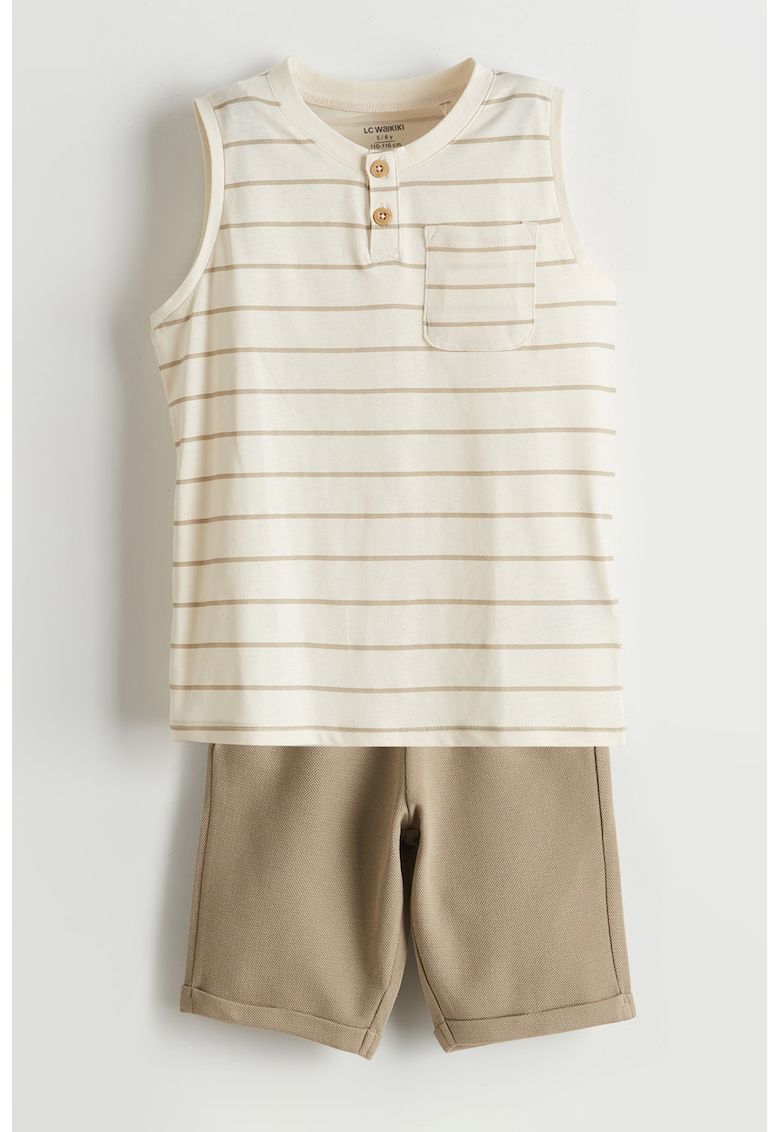 Caracteristici Continut pachet: top si bermude Culoare: alb fildes - bej inchis Stil: casual Imprimeu: dungi - uni Croiala: regular fit Material: bumbac Decolteu: rotund Lungime maneca: fara maneca Lungime pantaloni: scurti Colectie: primavara - vara Compozitie Exterior: 100% bumbac