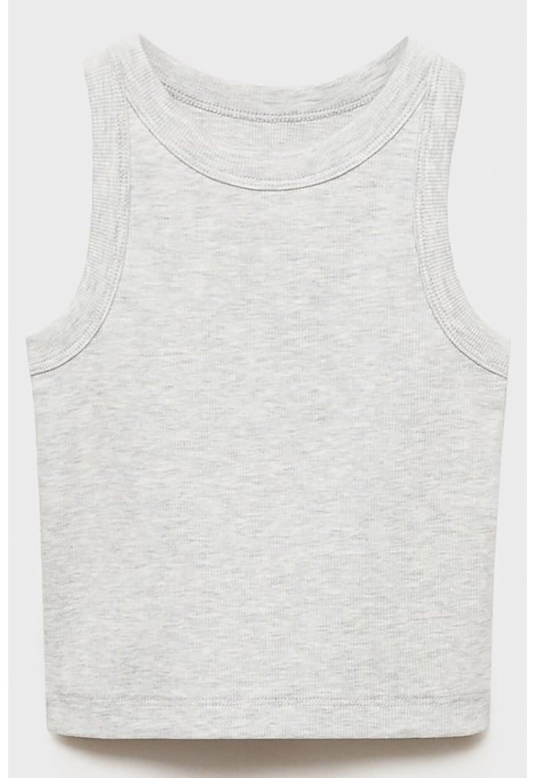 Caracteristici Culoare: gri deschis melange Material: bumbac Imprimeu: uni Croiala: crop Decolteu: la baza gatului Lungime maneca: fara maneca Detalii: aspect striat Compozitie Exterior: 93% bumbac - 5% elastan - 2% viscoza
