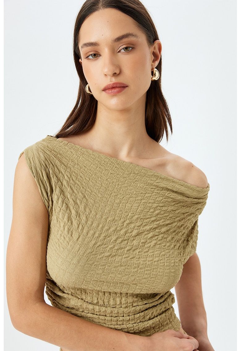 Caracteristici Culoare: kaki Imprimeu: uni Material: poliester Croiala: crop Model: in v Lungime maneca: fara maneca Compozitie Exterior: 99% poliester - 1% elastan