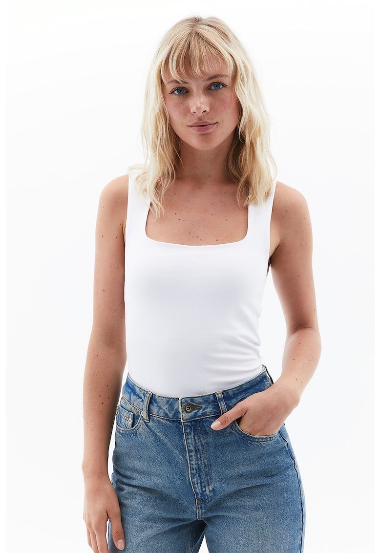 Caracteristici Culoare: alb optic Imprimeu: uni Material: bumbac - elastan Croiala: slim fit Model: patrat Lungime maneca: fara maneca Compozitie Exterior: 95% bumbac - 5% elastan
