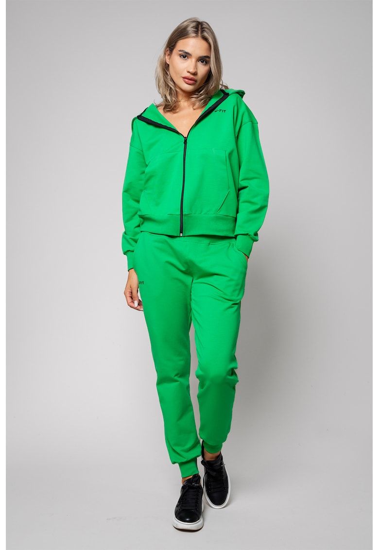 Caracteristici Culoare: verde marin Imprimeu: uni Material: bumbac Croiala: regular fit Lungime maneca: maneca lunga Buzunare: 2 laterale Lungime pantaloni: lungi Detalii: detaliu cu logo Sistem inchidere: fermoar Compozitie Exterior: 92% bumbac - 8% elastan