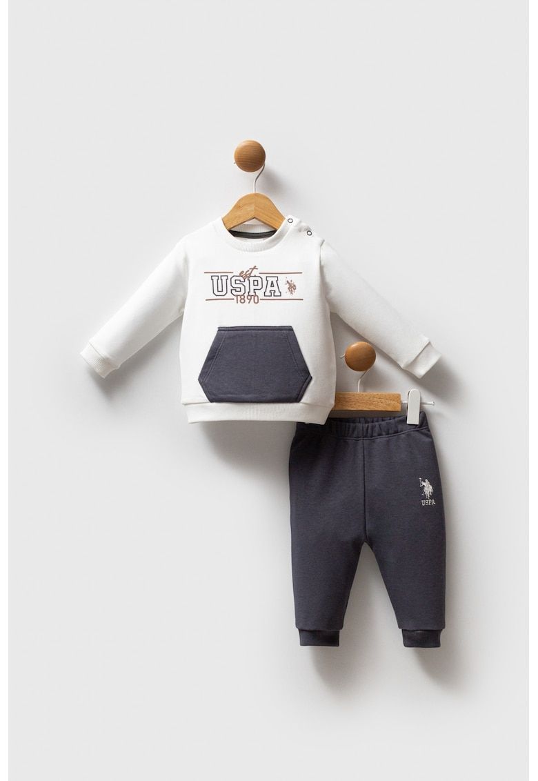 Caracteristici Continut pachet: bluza sport si pantaloni sport Culoare: alb - gri inchis Imprimeu: logo Croiala: regular fit Material: bumbac - elastan Lungime maneca: maneca lunga Lungime pantaloni: lungi Detalii: buzunar kangaroo Compozitie Exterior: 96% bumbac - 4% elastan