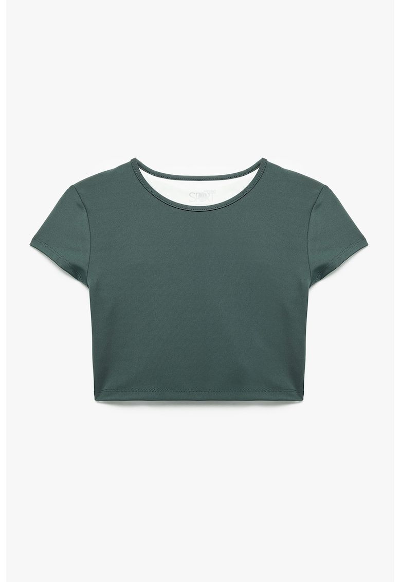 Caracteristici Culoare: verde persan Imprimeu: uni Material: sintetic Croiala: crop Model: decolteu la baza gatului Lungime maneca: maneca scurta Compozitie Exterior: 88% poliester - 12% elastan