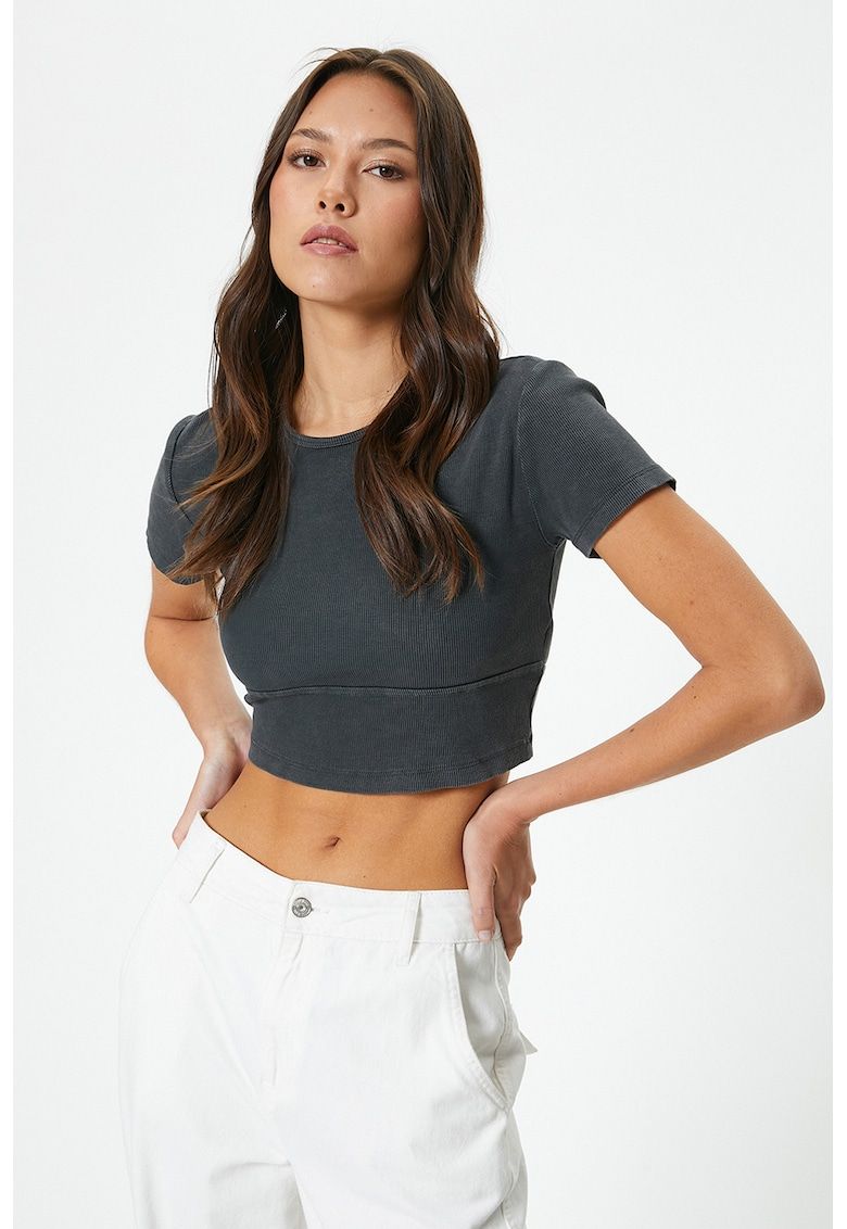 Caracteristici Culoare: gri antracit Imprimeu: uni Material: bumbac Croiala: crop Model: decolteu la baza gatului Lungime maneca: maneca scurta Compozitie Exterior: 97% bumbac - 3% elastan