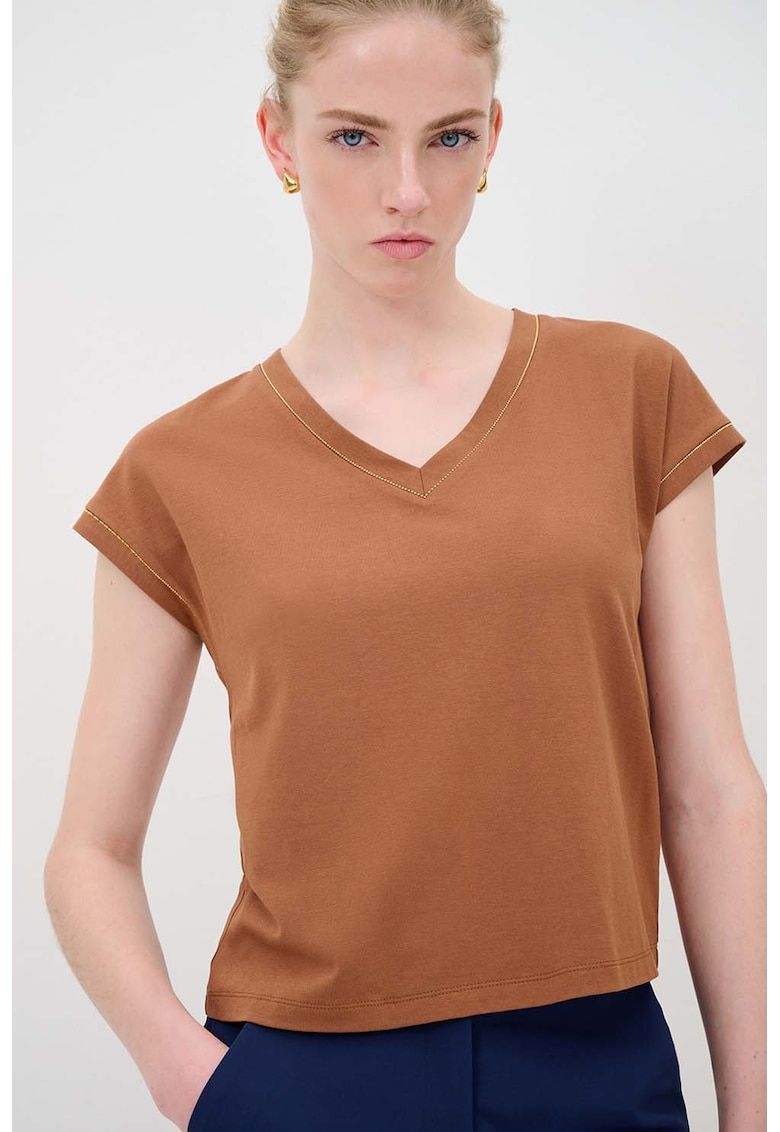 Caracteristici Culoare: caramel Imprimeu: uni Material: bumbac Croiala: regular fit Model: in v Lungime maneca: maneca scurta Compozitie Exterior: 47% modal. 47% bumbac - 6% elastan