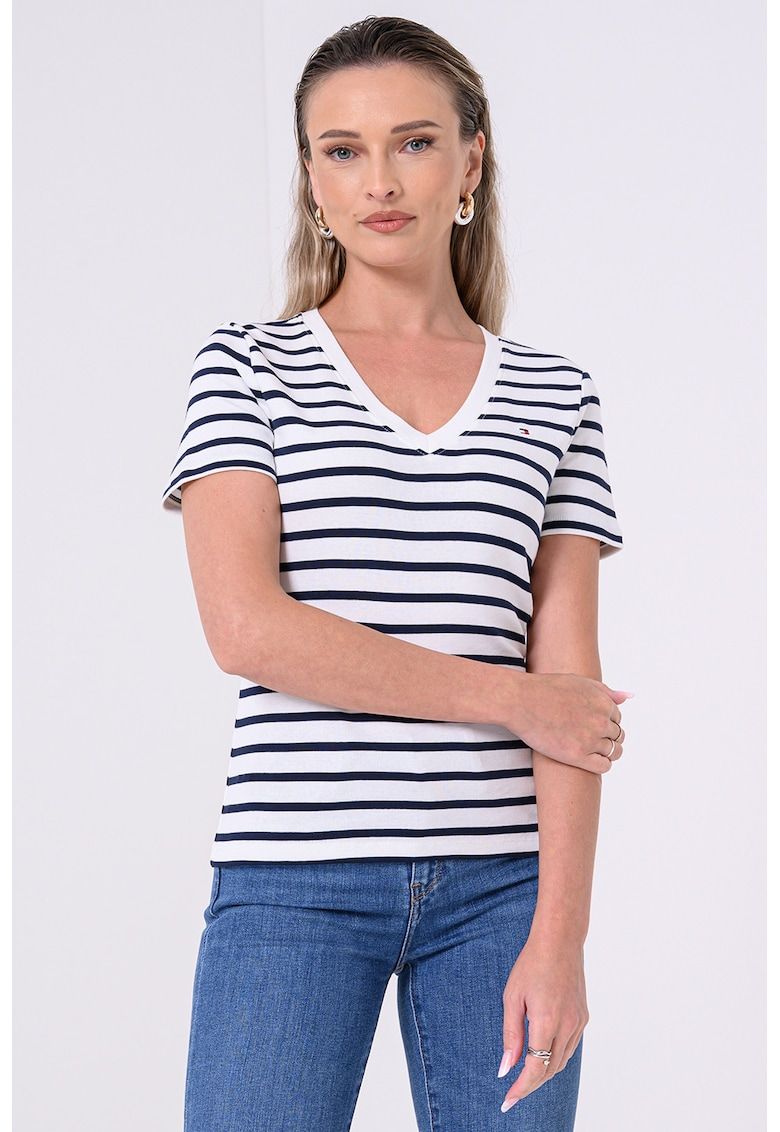 Caracteristici Culoare: alb - bleumarin Imprimeu: dungi Material: bumbac Croiala: slim fit Model: in v Lungime maneca: maneca scurta Compozitie Exterior: 100% bumbac Info model Modelul poarta un produs de marimea S. Marimi model: 174 cm inaltime - 84 cm bust - 64 cm talie - 90 cm sold