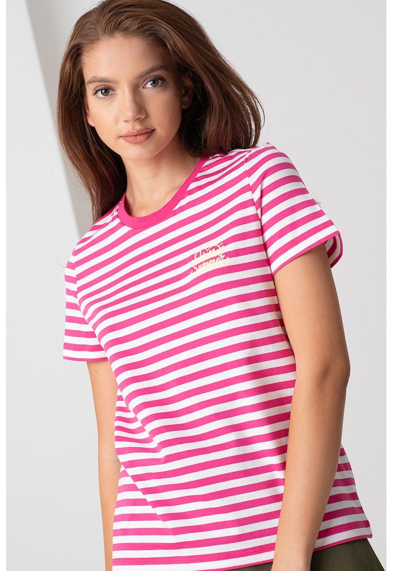 Caracteristici Culoare: fucsia - alb optic Imprimeu: dungi Material: bumbac organic Croiala: regular fit Model: decolteu la baza gatului Lungime maneca: maneca scurta Detalii: broderie Compozitie Exterior: 100% bumbac organic Info model Modelul poarta un produs de marimea S. Marimi model: 174 cm inaltime - 84 cm bust - 64 cm talie - 90 cm sold