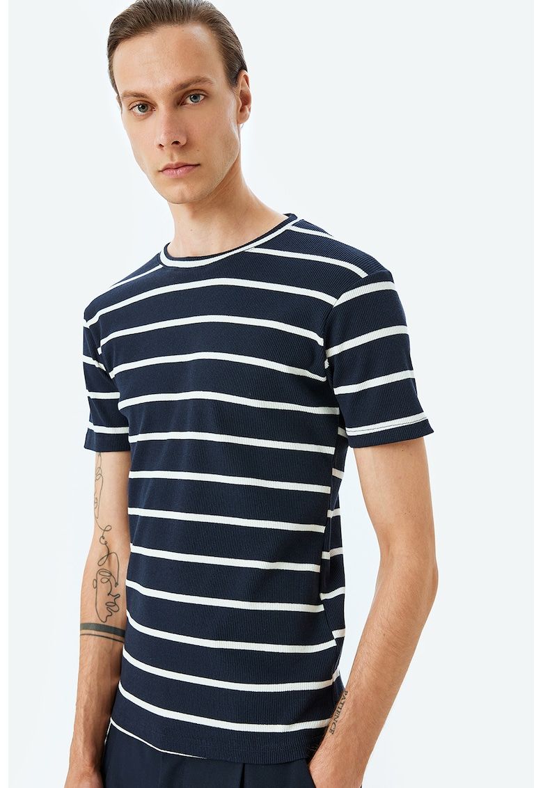 Caracteristici Culoare: albastru ultramarin - alb optic Imprimeu: dungi Material: sintetic - bumbac Croiala: regular fit Model: decolteu la baza gatului Lungime maneca: maneca scurta Compozitie Exterior: 50% poliester - 47% bumbac - 2% viscoza - 1% elastan