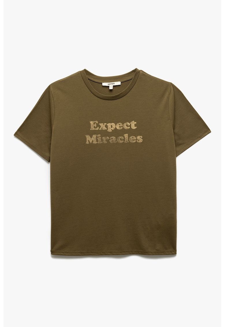 Caracteristici Culoare: verde masliniu Imprimeu: text Material: sintetic - viscoza Croiala: regular fit Model: rotund Lungime maneca: maneca scurta Compozitie Exterior: 63% poliester - 37% viscoza
