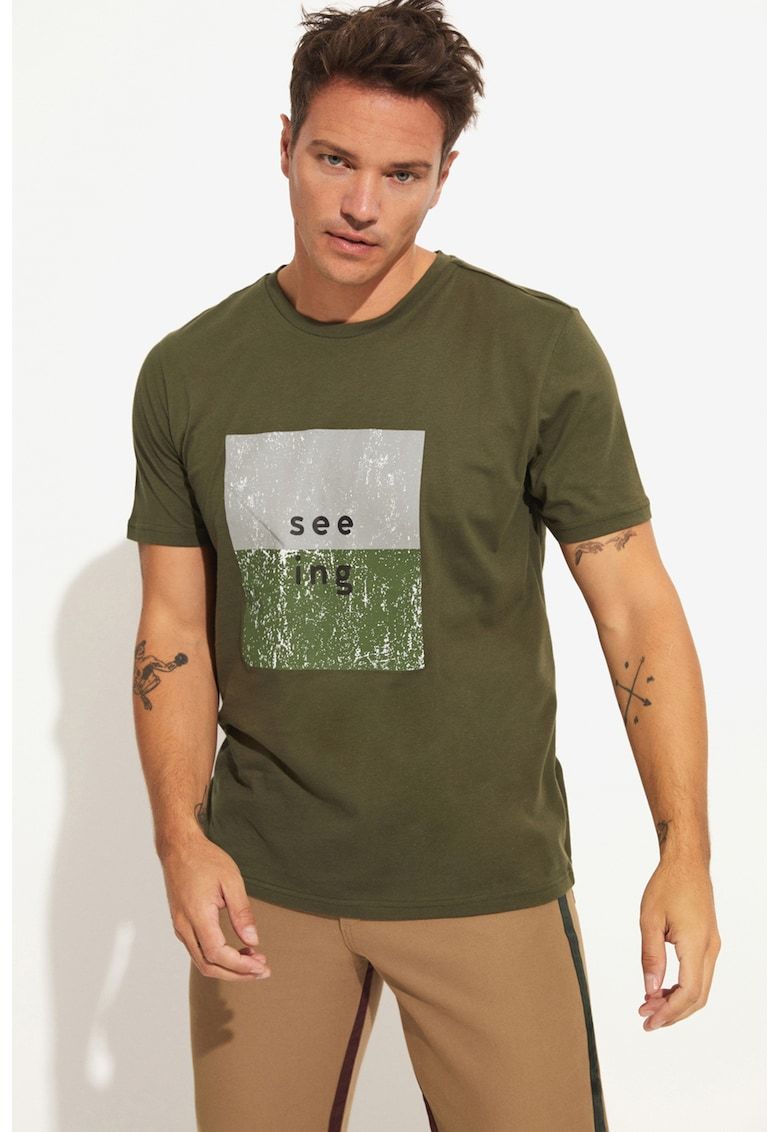 Caracteristici Culoare: gri cenusiu - kaki Imprimeu: grafic Material: bumbac Croiala: regular fit Model: decolteu la baza gatului Lungime maneca: maneca scurta Compozitie Exterior: 100% bumbac