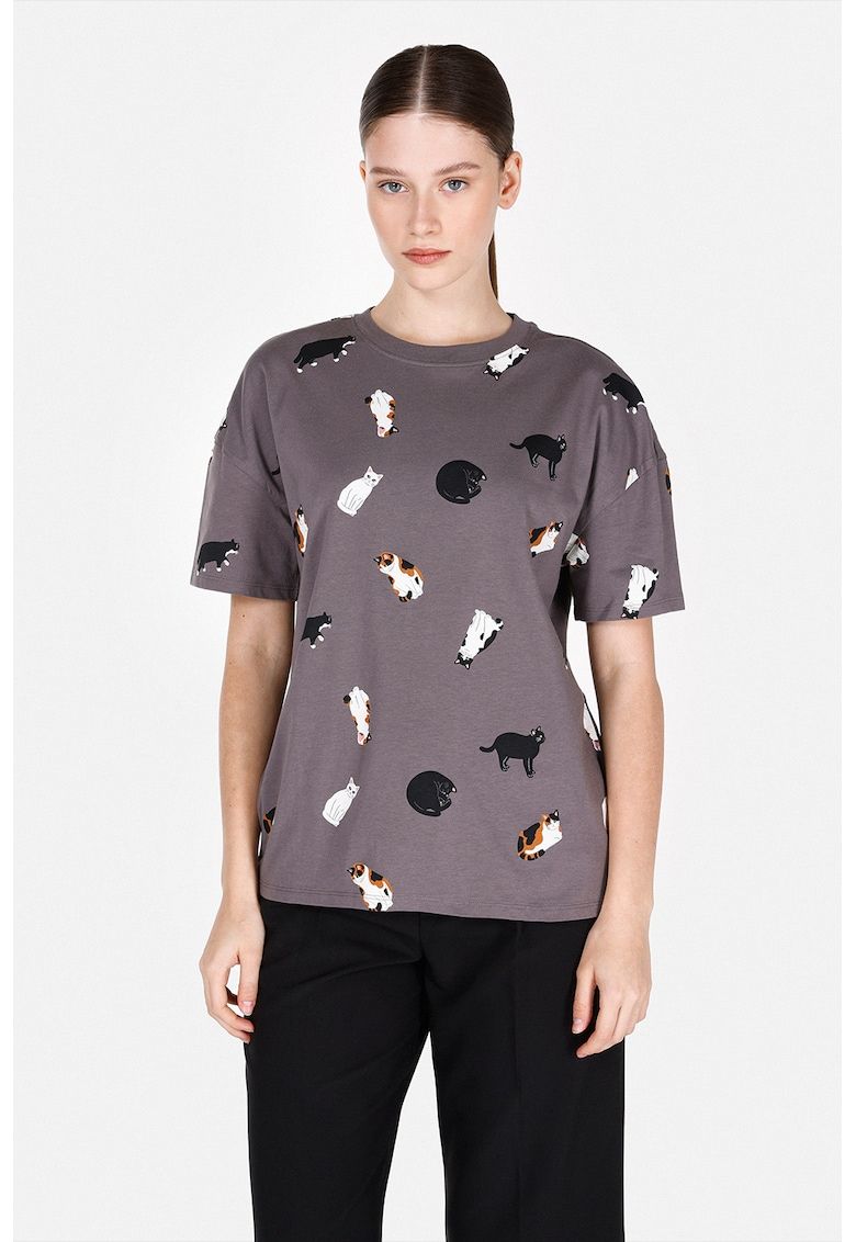 Caracteristici Culoare: alb - violet prafuit Imprimeu: animale Material: bumbac Croiala: regular fit Model: decolteu la baza gatului Lungime maneca: maneca medie Compozitie Exterior: 100% bumbac