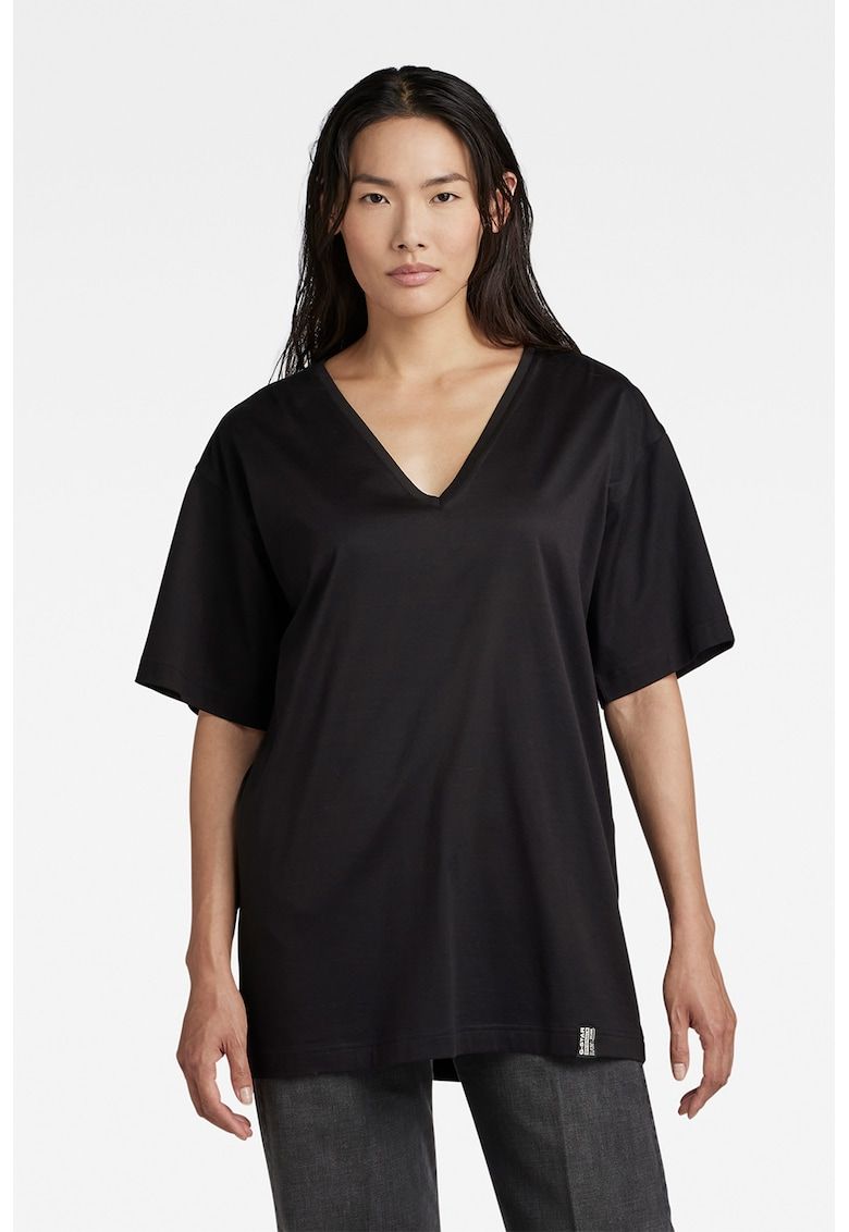 Caracteristici Culoare: negru Imprimeu: uni Material: bumbac Croiala: lejer Model: in v Lungime maneca: maneca scurta Compozitie Exterior: 100% bumbac