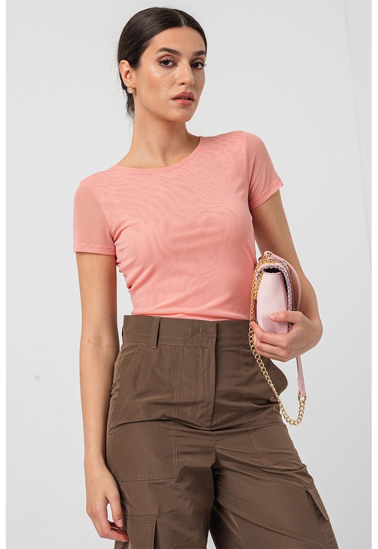 Caracteristici Culoare: roz somon Imprimeu: uni Material: sintetic Croiala: regular fit Model: decolteu la baza gatului Lungime maneca: maneca scurta Compozitie Exterior: 95% poliester - 5% elastan Info model Modelul poarta un produs de marimea S. Marimi model: 179 cm inaltime - 82 cm bust - 60 cm talie - 94 cm sold