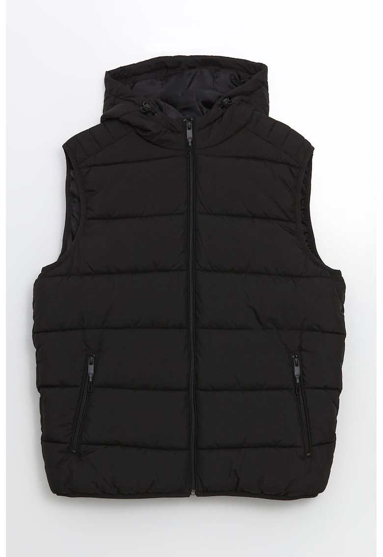 Caracteristici Tip produs: vesta Culoare: negru Material: poliester Croiala: regular fit Imprimeu: uni Gluga: cu gluga Lungime maneca: fara maneca Buzunare: 2 buzunare oblice cu fermoar Sistem inchidere: fermoar Compozitie Exterior: 100% poliester